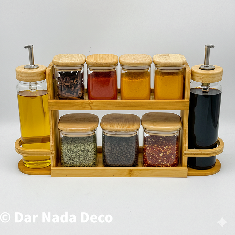 Ensemble de 10 Pots à Epices et 2 Bouteilles d’Huile avec Support en bambou