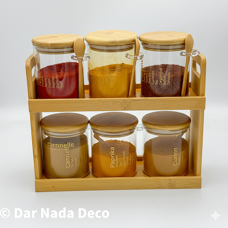 Ensemble de 7 Pots à Epices et 2 Bouteilles d’Huile avec Support en bambou